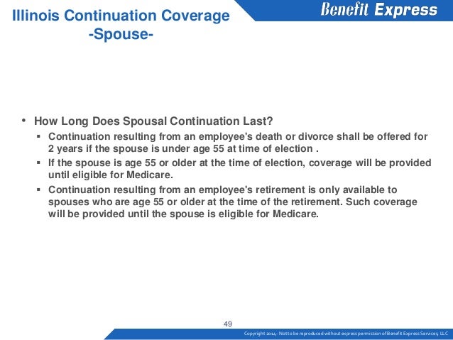 Under COBRA an individual may be entitled to up to 18 months 29 months or 36 months of continuation coverage depending upon which qualifying events triggered the COBRA coverage. Illinois however offers greater protection to spouses aged 55 or older and their dependents upon divorce or death of. Contact the MyBenefits Service Center toll free 844-251-1777 or 844-251-1778 TDDTTY Monday - Friday 800 AM - 600 PM CT for information regarding COBRA.